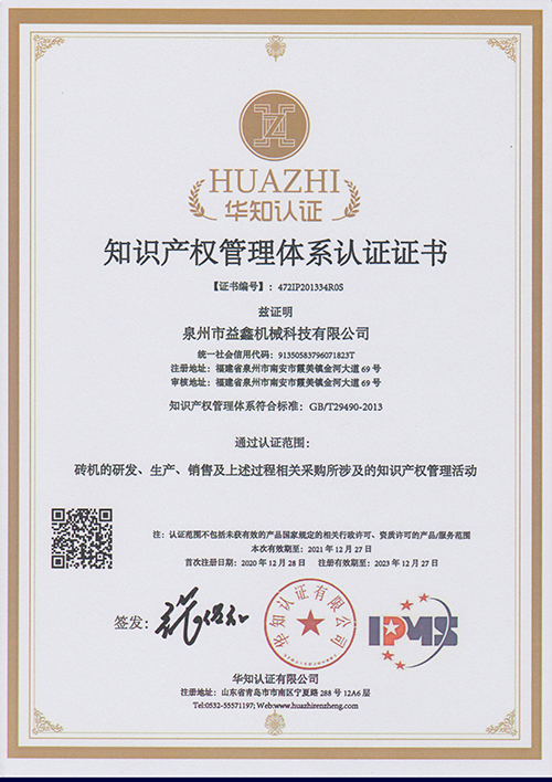 2020年12月底,泉州市益鑫機(jī)械科技有限公司(益鑫磚機(jī))憑借其知識產(chǎn)權(quán)管理體系的規(guī)范性